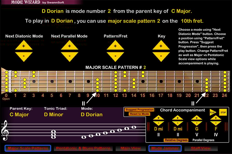 Mode Wizard software displays all modes, chords (triads and 4-part), notes on the staff, and scale diagrams for all 15 of the diatonic keys. You can toggle between 7-note scales and pentatonic/blues scales. There is also a "mode jammer" tab that lets you choose a key and a mode, then jam to the accompanying progression, which you can customize.
